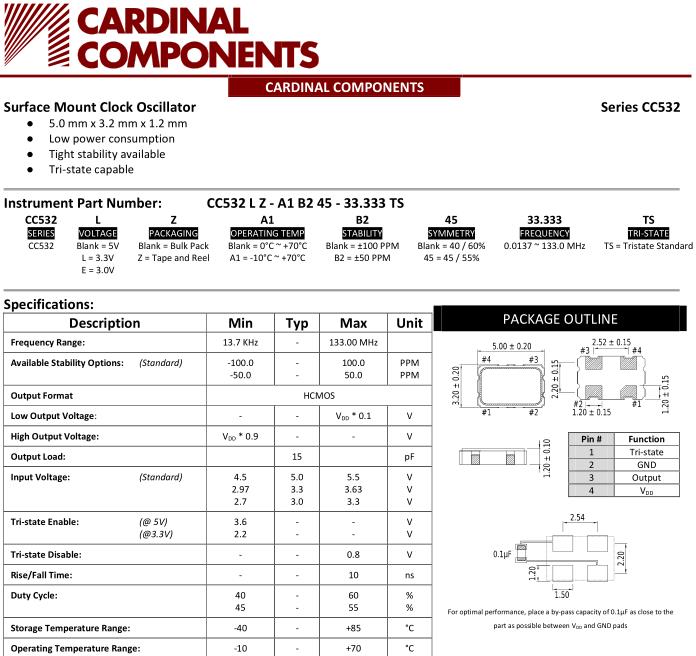 卡迪納爾晶振,CC532進口時鐘振蕩器,CC532LZ-A1B245-20.000TS晶振