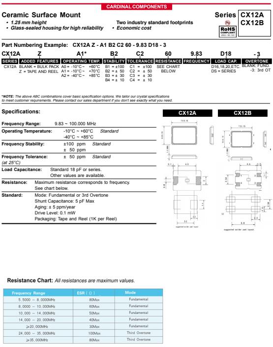 美國卡迪納爾晶振,CX12A/CX12B無源貼片晶振,CX12AZ-A2-B3C360-9.83D20-3晶振,Cardinal晶振根據需要,提高環境技術、材料和壓電石英晶體元器件,貼片晶振,石英晶振,有源晶振,壓控振蕩器,壓電石英晶體、有源晶振產品的發展信息及環境管理活動的公開性.