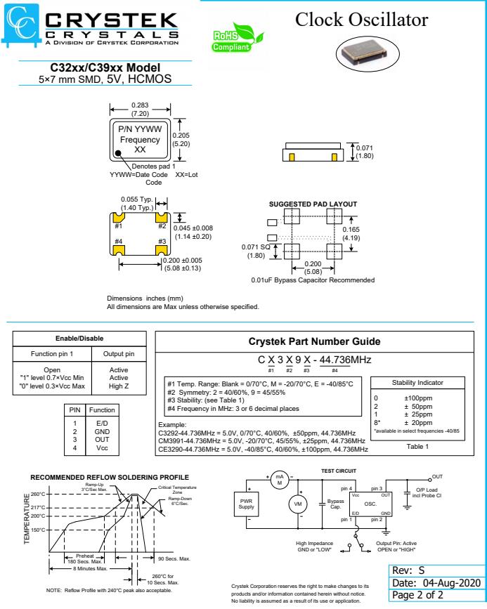 Symmetry: (Standard “2”) 40/60% Max @ 50% Vdd (Option “9”) 45/55% Max @ 50% Vdd Rise/Fall Time: 6ns Max @ 20% to 80% Vdd Logic: "0" = 10% Vdd Max "1" = 90% Vdd Min Disable Time: 200ns Max Start-up Time: 10ms Max Load: 30pF Max |