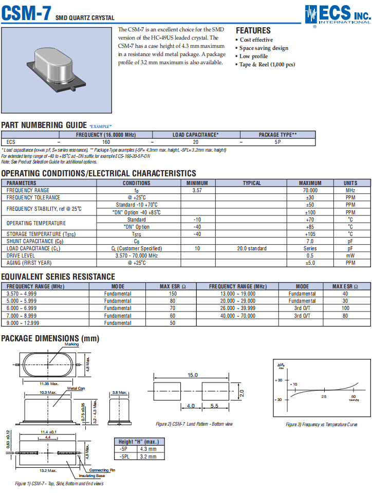 ECS-250-18-5P-F-TR,CSM-7諧振器,ECS藍牙模塊晶振,兩腳貼片晶振,規格表