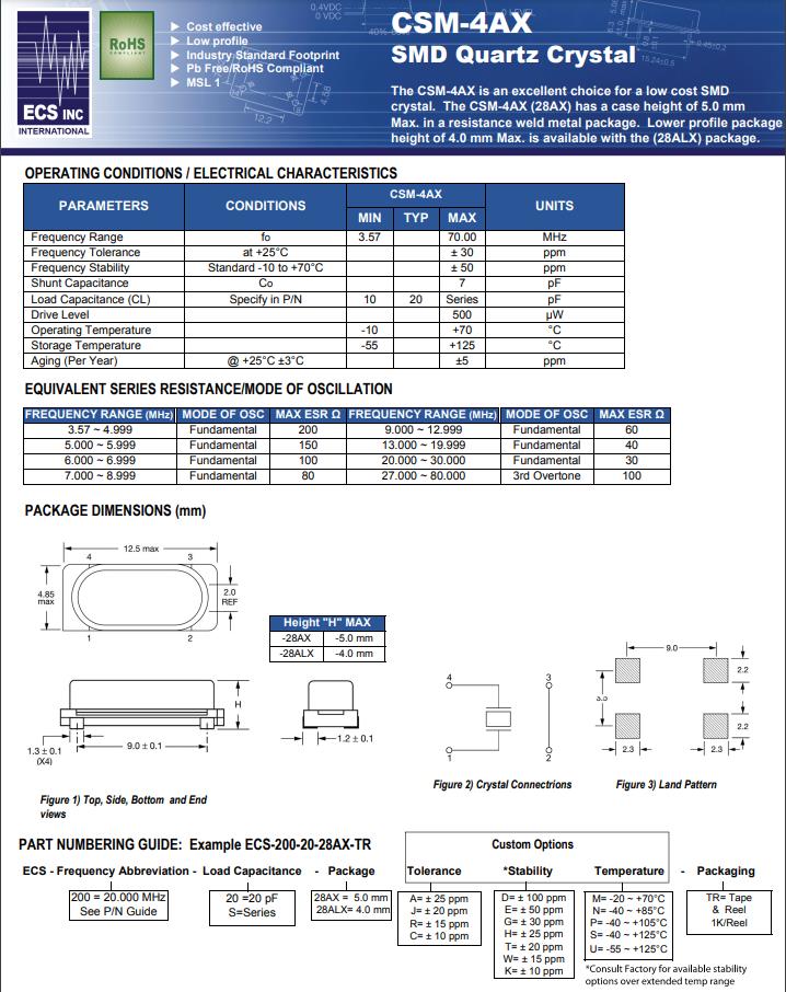 | ECS-40-20-28AX-TR | CSM-4AX | MHz Crystal | 4MHz | ±50ppm | ±30ppm | 20pF |
