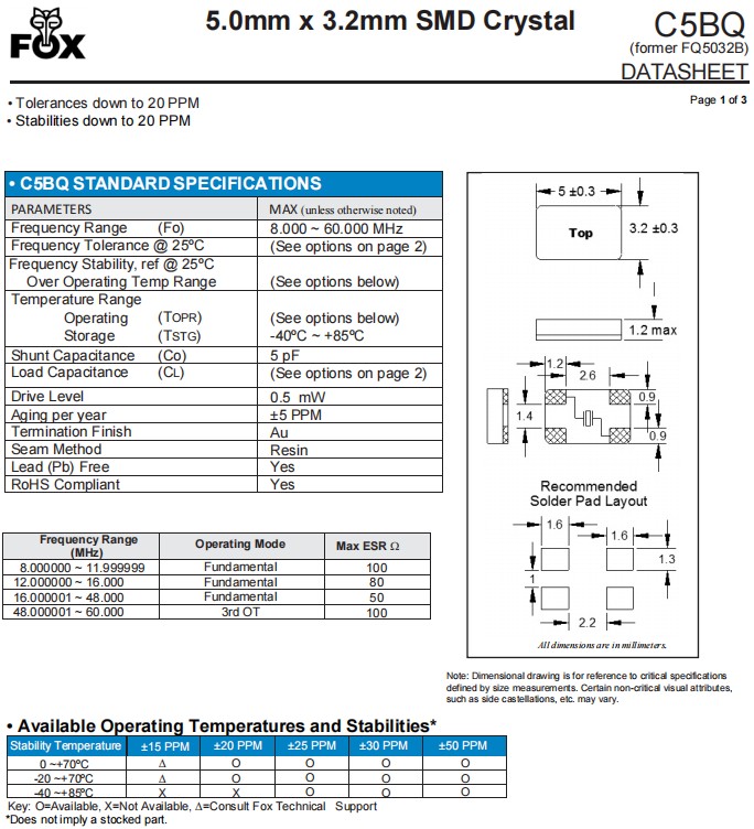 | FC5BQCCMC16.0-T1 | Fox 晶振 | C5BQ | 16 MHz | ±30ppm | ±30ppm | 20pF | 0°C ~ 70°C |