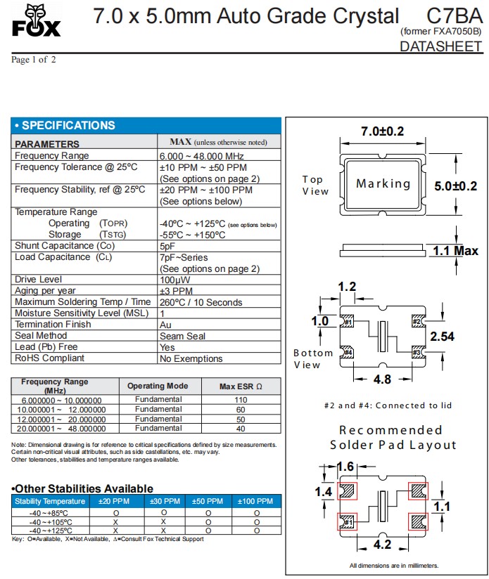 | FC7BACAGI25.0-T1 | Fox 晶振 | C7BA | 25 MHz | ±100ppm | ±30ppm | 12pF | -40°C ~ 125°C |