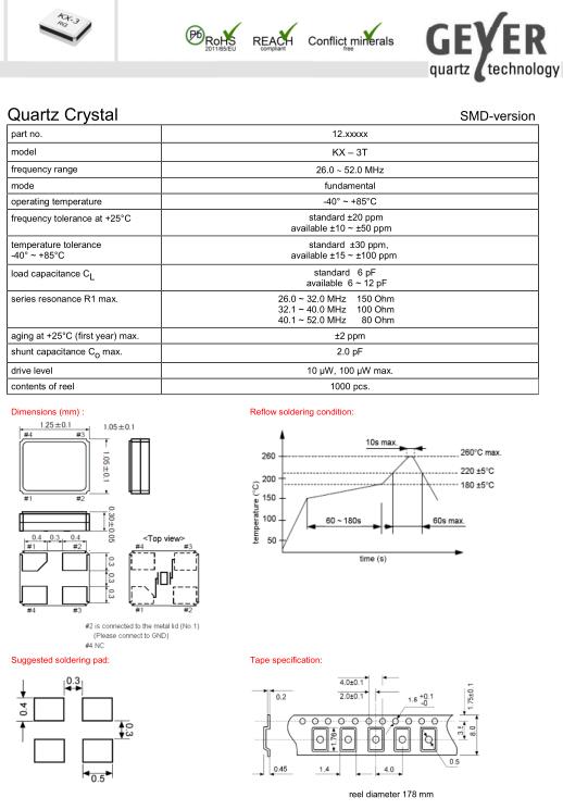 GEYER高品質晶振,KX-3T無源諧振器,四腳貼片晶振, 貼片晶振本身體積小,超薄型石英晶體振蕩器,特別適用于有目前高速發展的高端電子數碼產品,因為晶振本身小型化需求的市場領域,小型,薄型是對應陶瓷振蕩器(偏差大)和普通的石英晶體振蕩器(偏差小)的中間領域的一種性價比較出色的產品.產品廣泛用于筆記本電腦,無線電話,衛星導航SSD,USB,Blu-ray等用途,符合無鉛焊接的高溫回流焊曲線特性.