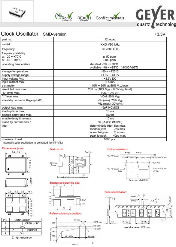 GEYER進口晶振,KXO-V96-kHz低抖動晶振,時鐘振蕩器,小體積SMD時鐘振蕩器,是貼片音叉晶體,千赫頻率元件,應用于時鐘模塊,智能手機,全球定位系統,因產品本身體積小,SMD編帶型,可應用于高性能自動貼片焊接,被廣泛應用到各種小巧的便攜式消費電子數碼時間產品,環保性能符合ROHS/無鉛標準.