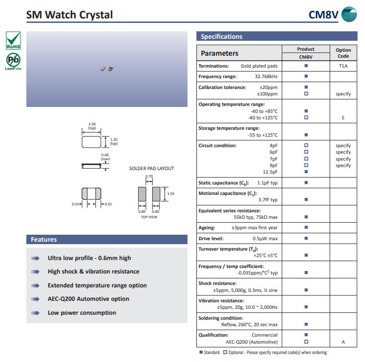 Golledge晶振,CM8V晶振,2012二腳晶振此款SMD晶體并且可以承受回流焊接的高溫,波峰焊接,回流焊接等,貼片表晶主要特點是該產品排帶包裝,焊接模式主要使用SMT焊接,給現代SMT工藝帶來高速的工作效率,32.768K系列產品本身具有體積小,厚度薄,重量輕等特點,此音叉型石英晶體諧振器,晶振產品本身具備優良的耐熱性,耐環境特性,在辦公自動化,家電領域,移動通信領域可發揮優良的電氣特性,符合無鉛標準,滿足無鉛焊接的回流溫度曲線要求,金屬外殼的石英晶振使得產品在封裝時能發揮比陶瓷晶振外殼更好的耐沖擊性能.