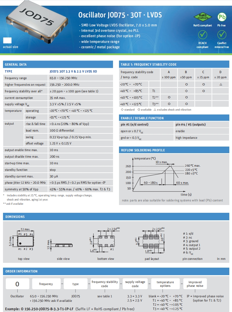 Jauch晶振,O 155.520-JOD75-B-3.3-T3-LF,6G光纖通道晶振,歐美進口晶振,Jauch晶振,JOD75有源晶振,石英晶體振蕩器,O 155.520-JOD75-B-3.3-T3-LF晶振,LVDS晶振,7050mm晶振,貼片石英晶振,差分晶振,頻率155.52MHz,電壓3.3V,工作溫度-40~125°C,頻率穩定性50ppm,耐高溫晶振,低相位抖動晶振,6G光纖通道晶振,物聯網晶振,全球導航衛星系統晶振,汽車信息娛樂系統晶振.