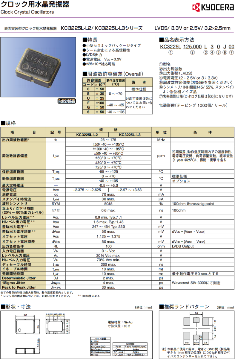 | KC3225L156.250L3GJ00 | KYOCERA晶振 | KC3225L-L3 | XO (Standard) | 156.25 MHz | LVDS | 3.3V |