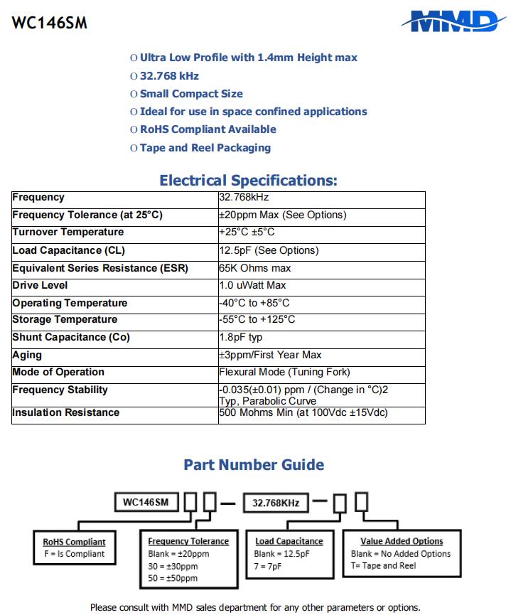麥迪康進口晶振,WC146SMF-32.768KHZ-T,6G基站晶振規格表
