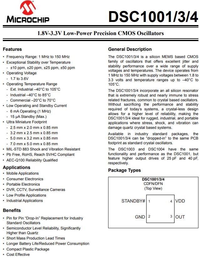 | DSC1001DI1-004.0000T | Microchip Technology | DSC1001 | 4MHz | 1.8 V ~ 3.3 V | 0.098" L x 0.079" W (2.50mm x 2.00mm) |