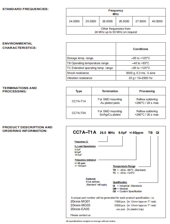 CC7A-T1A-26.000MHz-3.0pF-50ppm-TA-QI,6G以太網晶振,高頻貼片石英晶體規格表