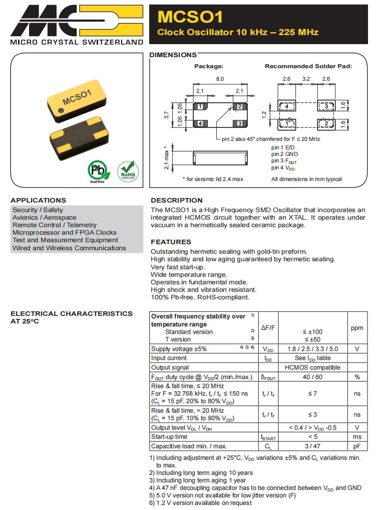 MCSO1CHVT-B-32.000MHz-E/D-T3,6G路由器晶振,高頻貼片振蕩器,瑞士微晶晶振,MCSO1進口有源晶振,MCSO1CHVT-B-32.000MHz-E/D-T3晶振,8037mm晶振,高頻貼片振蕩器,頻率32MHz,電壓3.3V,頻率穩定性50ppm,工作溫度-40~85°C,無鉛環保晶振,低老化晶振,6G路由器晶振,安保應用晶振,航空電子晶振,微處理器晶振,測試和測量設備晶振.