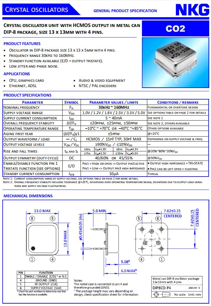 NKG Crystal|CO2-5-B-10.2400-WNS-EXT|正方形鐘振,NKG晶振,CO2正方形鐘振,進口有源晶振,CO2-5-B-10.2400-WNS-EXT晶振,石英振蕩器,四腳插件晶振,13 x 13 x 5mm四腳插件封裝,支持待機功能,頻率10.24MHz,電壓3.3V,負載15pF,工作溫度-40~85°C,頻率穩定性50ppm,低抖動晶振,高品質晶振,抗震動晶振,專業視頻設備晶振,以太網晶振,CPU顯卡晶振,PAL編碼器晶振.