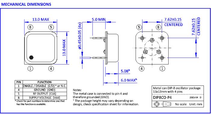 ●振蕩器DIP-8封裝尺寸13 x 13 x 5mm, 4引腳