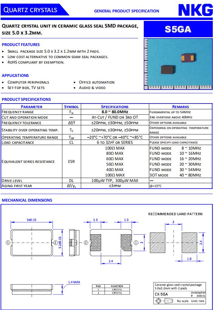 NKG晶振|S5GA38.400F18M25-EXT|5032無源晶振特點