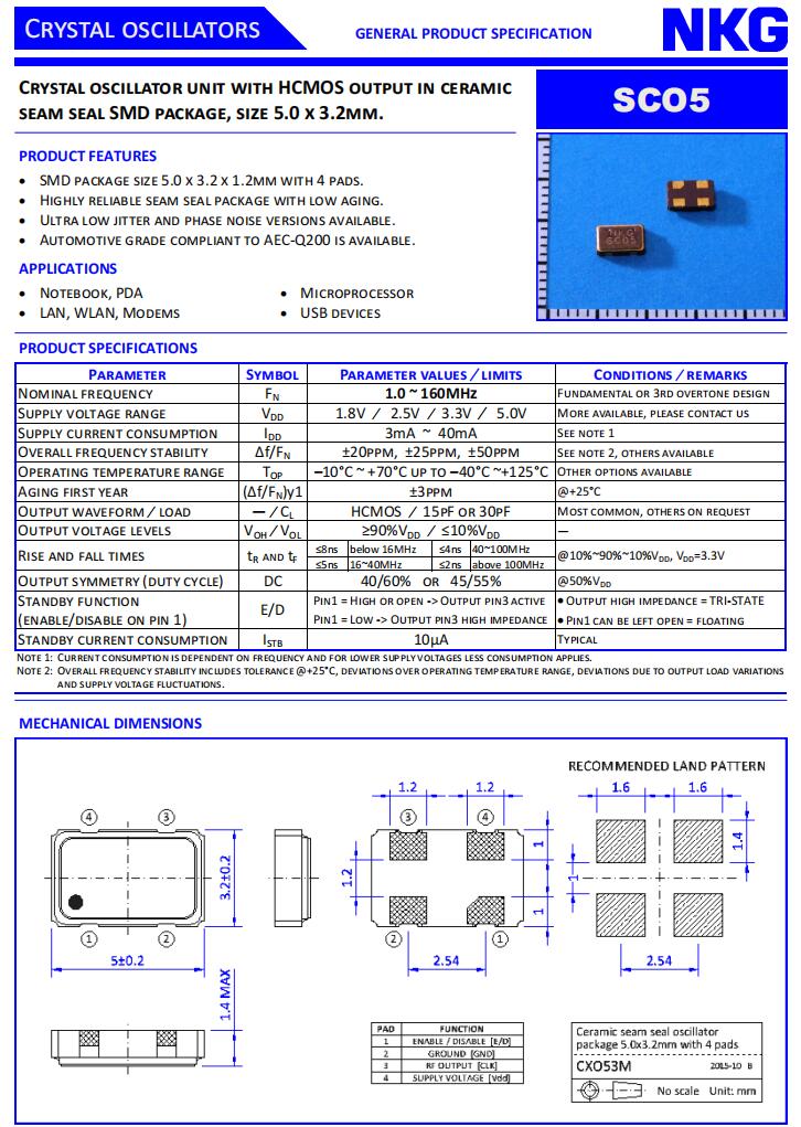 NKG晶振|SCO5-6-A-32.0000-MTS-EXT|5032mm振蕩器規格表