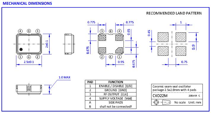 ●SMD封裝尺寸為2.5 x 2.0 x 1.0mm,帶有4個襯墊