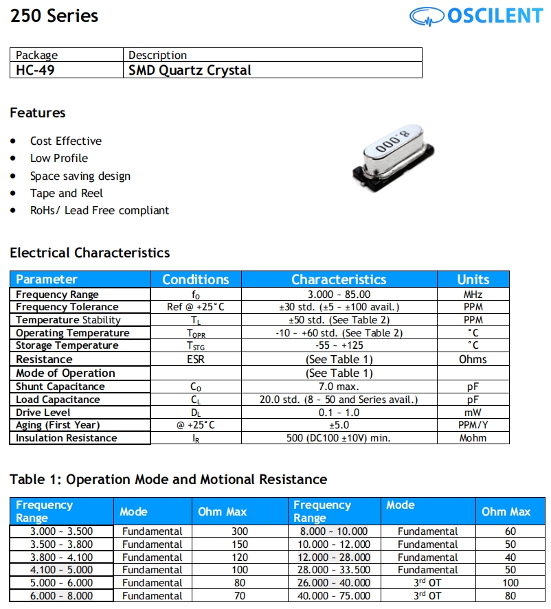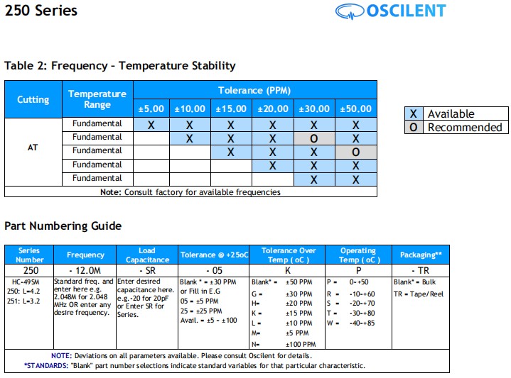 OSCILENT晶振,250-14.7456M-20-05KS-TR,6G無線局域網晶振規格表