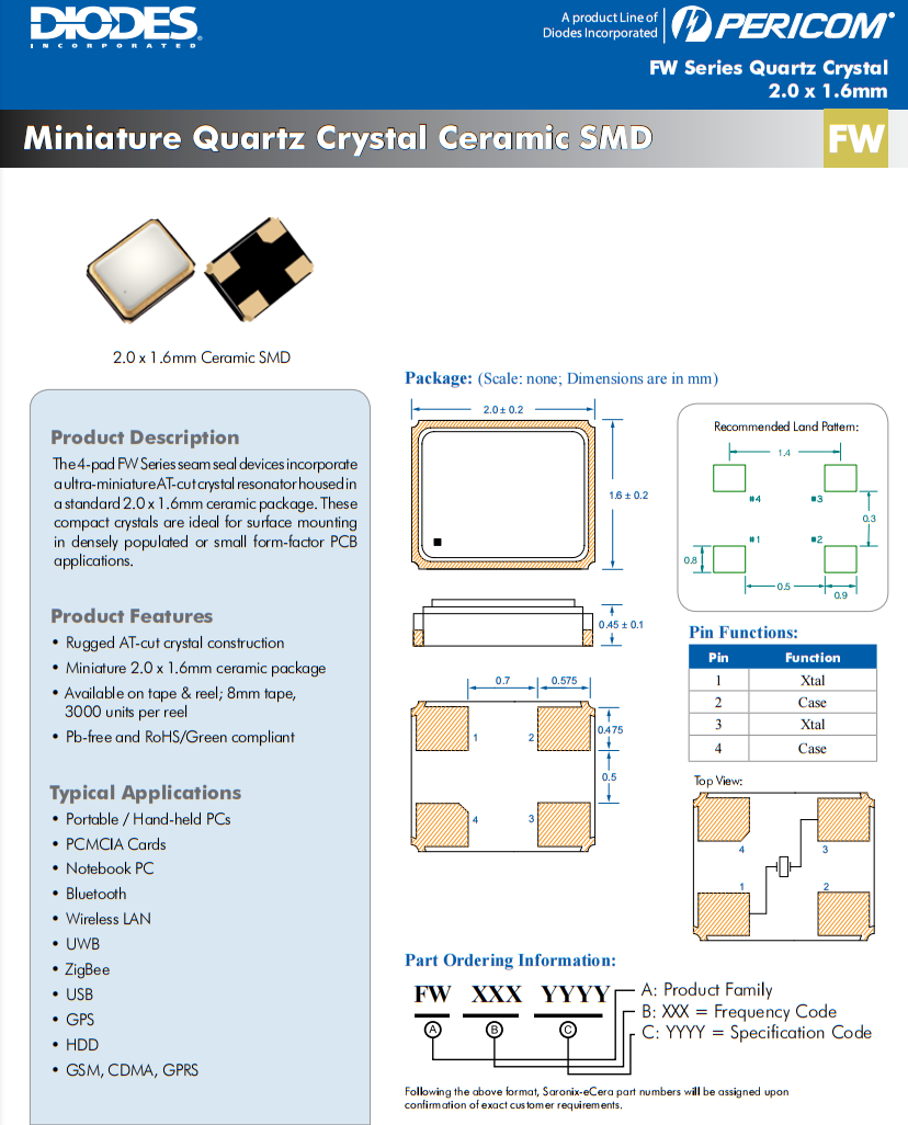 | FW1600015 | Diodes晶振 | FW | 16 MHz | ±20ppm | ±10ppm | 8pF |