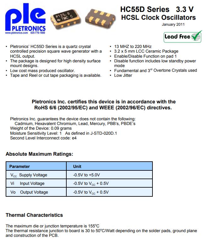 Pletronics晶振,HC55D晶振,HCSL3.3V晶振