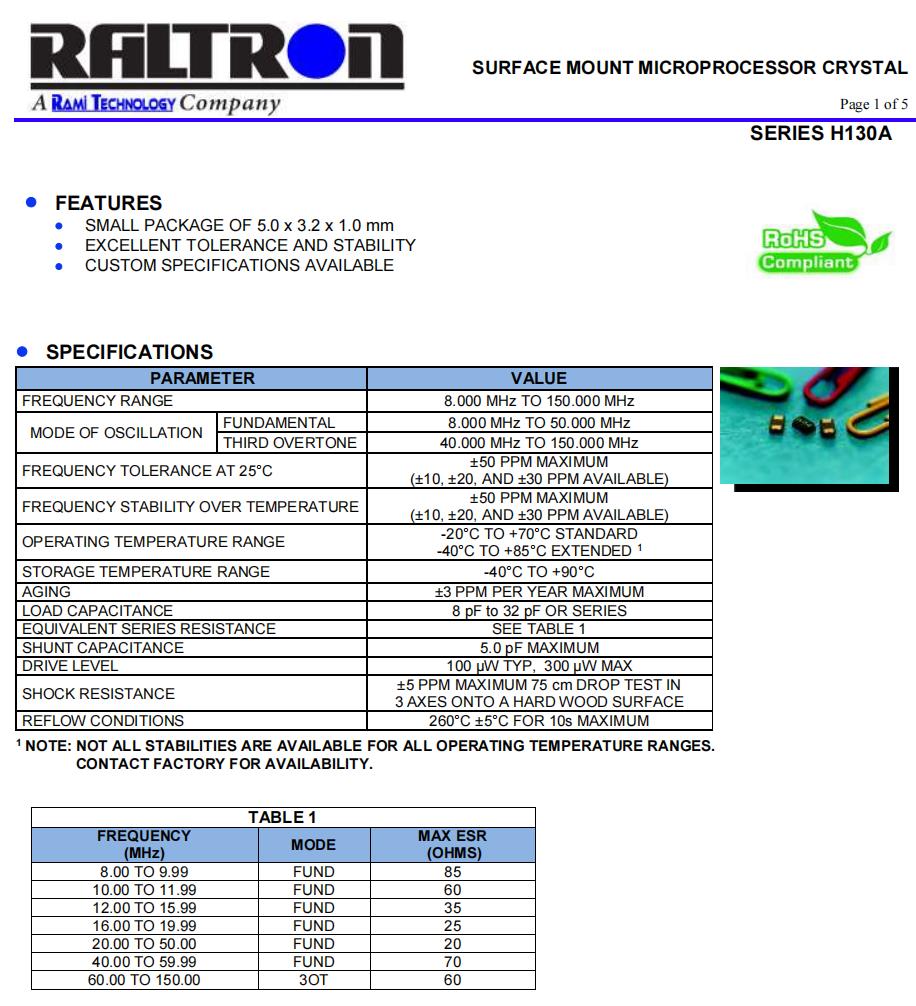 | Raltron原廠編碼 | 型號 | 頻率 | 尺寸 | 頻率偏差 | 頻率穩定度 | 負載 | 工作溫度 |