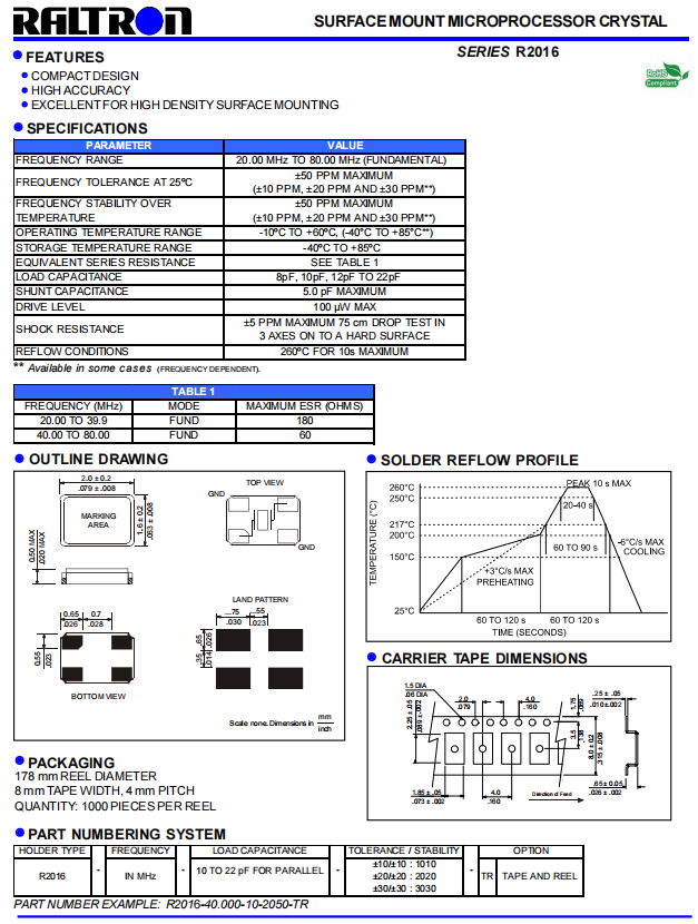 | R2016-16.000-9-1010-TR-NS1 | R2016 | 16.000MHz | 2.0 x 1.6mm | ± 10 ppm | ± 10 ppm | 9 pF | -20°C~+75°C |