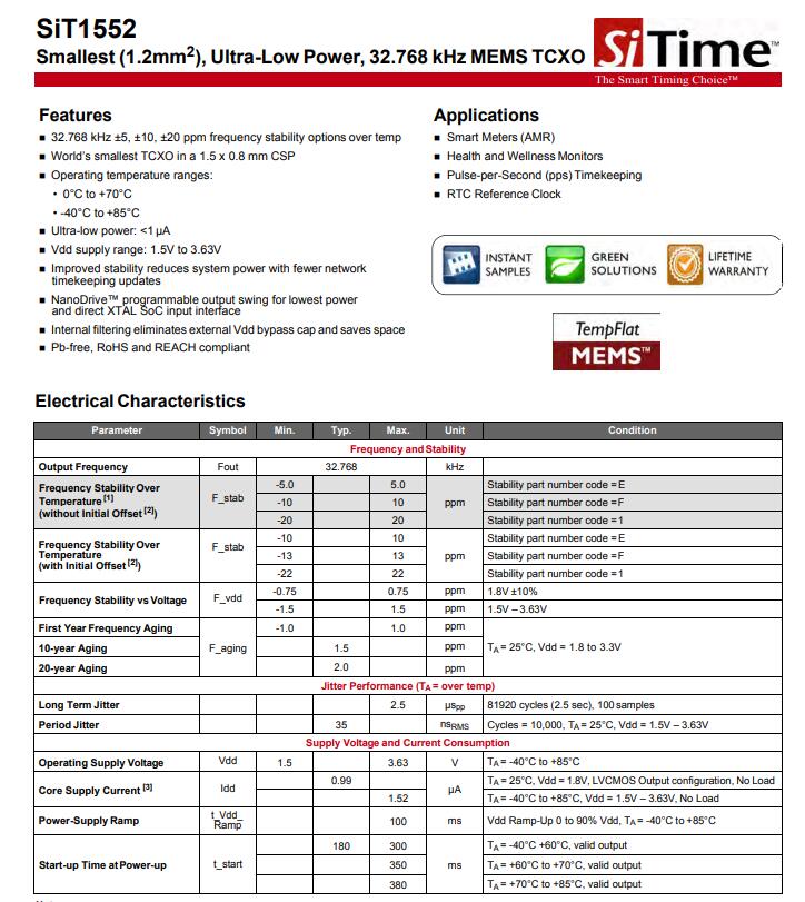 本產品具有小型,薄型,輕型的貼片晶振表面型音叉式石英晶體諧振器,產品具有優良的耐熱性,耐環境特性,可發揮晶振優良的電氣特性,符合RoHS規定,滿足無鉛焊接的高溫回流溫度曲線要求,金屬外殼的封裝使得產品在封裝時能發揮比陶瓷諧振器外殼更好的耐沖擊性.SiTime晶振,SiT1552晶振,溫補晶振