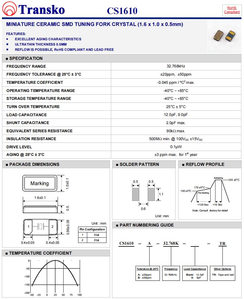 特蘭斯科晶振,CS1610-A-32.768K-TR,6G基站晶振規格表