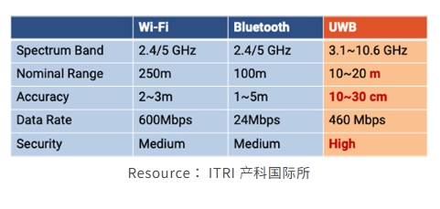 UWB 的頻譜范圍在 3.110.6 GHz,遠超 WiFi 和藍牙的 2.45 GHz 范圍。 由于運行在更高的頻率范圍內并具有更多的帶寬,UWB 能夠傳輸更多的數據,使其成為高速度短距離數據傳輸的理想選擇。 UWB 的精確度達到 1030 厘米,遠超 WiFi (23 米) 和藍牙 (1~5 米)。