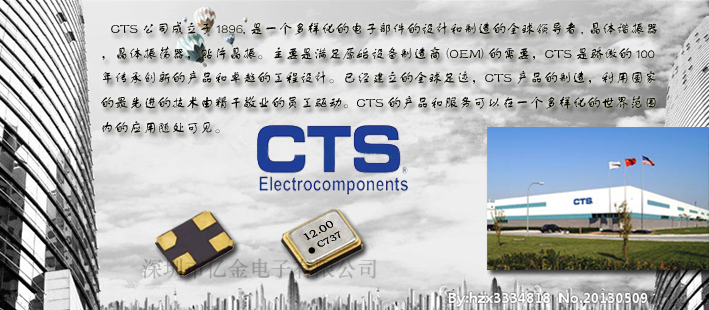 CTS是一家集晶體的研發、生產、銷售為主的晶振廠家.產品主要面向為國內通信,衛星導航,GPS,車載多媒體,電腦主板,筆記本,電子數碼選擇應用領域,以及出口的海外客戶需求.公司擁有業界領先的晶振自動測試系統,日本全自動生產檢測電腦儀器設備,和瑞士ERC公司銣原子頻標的工廠頻率基準,頻譜分析儀,網絡分析儀,合成信號源等高端儀器設備.