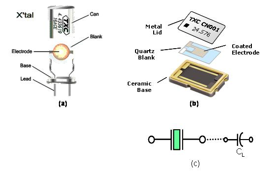 石英是由硅原子和氧原子組合而成的二氧化硅(Silicon Dioxide, SiO2), 以32點群的六方晶系形成的單結晶結構.單結晶的石英晶體結構具有壓電效應特性, 當施加壓力在晶體某些方向時, 垂直施力的方向就會產生電氣電位. 相對的當以一個電場施加在石英晶體某些軸向時, 在另一些方向就會產生變形或振動現象. 掌握單結晶石英材料的這種壓電效應, 利用其發生共振頻率的特性, 發揮其精確程度作為各類型頻率信號的參考基準, 就是水晶震蕩器的設計與應用. 因為石英晶體具有很高的材料Q值,所以絕大部份的頻率控制組件,如共振子及振蕩器,都以石英材料為基礎. 以石英為基礎的頻率控制組件可以依其壓電振動的屬性, 可以分為體波(bulk wave)振動組件及表面聲波(surface acoustic wave)振動組件. 體波振動組件如石英晶體共振子, 石英晶體濾波器及石英晶體振蕩器, 表面波振動組件如表面波濾波器及表面波共振子.