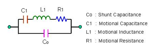 就是將石英晶體共振子轉換成振蕩頻率附近的Butterworth-Van Dyke (BVD)等效電路. 在這個圖中, 有四個主要參數 : 靜態電容-Co, 動態電容-C1, 動態電感-L1及動態電阻-R1.