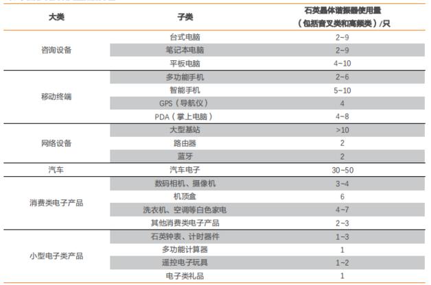 石英晶體諧振器廣泛應用于工業、民用和軍事等電子產品領域,部分應用終端對石英晶體諧振器需求量如下表所列: