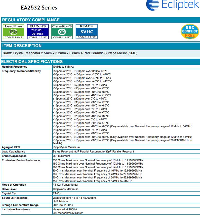 | EA2532QA18-12.000M TR | Ecliptek石英晶體 | EA2532 | MHz 晶體 | 12 MHz | ±20ppm | ±15ppm | 18pF | CRYSTAL 12.0000MHZ 18PF SMD |