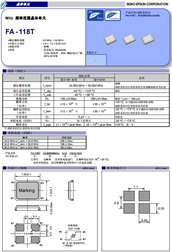 超小型1612mm貼片晶振FA-118T是目前愛普生石英晶體諧振器MHz級別外部尺寸最小的一款無源晶振,因此晶振本體上沒有印字,而是空白的,頻率范圍:24MHz至54MHz,四腳貼片晶振,工作溫度范圍-40℃至+85℃,FA-118T晶振體積小,焊接可采用自動貼片系統,產品本身小型,表面貼片晶振,特別適用于有小型化要求的電子數碼產品市場領域。因產品小型,薄型優勢,耐環境特性,包括耐高溫,耐沖擊性等,在移動電話,移動通信領域得到了廣泛的應用,晶振產品本身可發揮優良的電氣特性,滿足無鉛焊接的高溫回流溫度曲線要求。