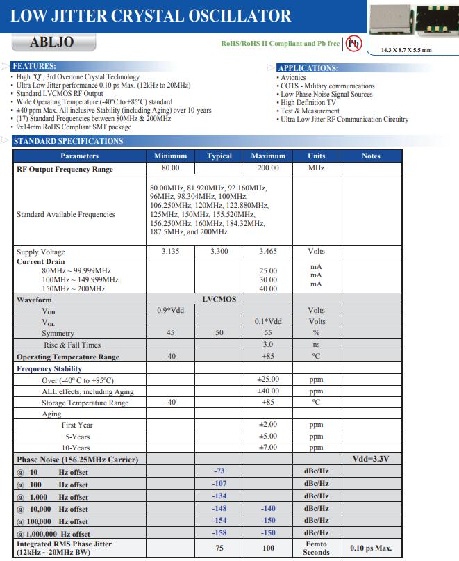 ABRACON旗艦ABLNO系列提供超低相位噪聲固定時鐘或電壓控制晶體振蕩器(VCXO)解決方案標準尺寸為9x14mm。同超過12 kHz的37fs典型RMS抖動20MHz帶寬@ 100MHz載波,ABLNO是性能驅動的理想選擇通訊,射頻,無線回程,和儀器應用。