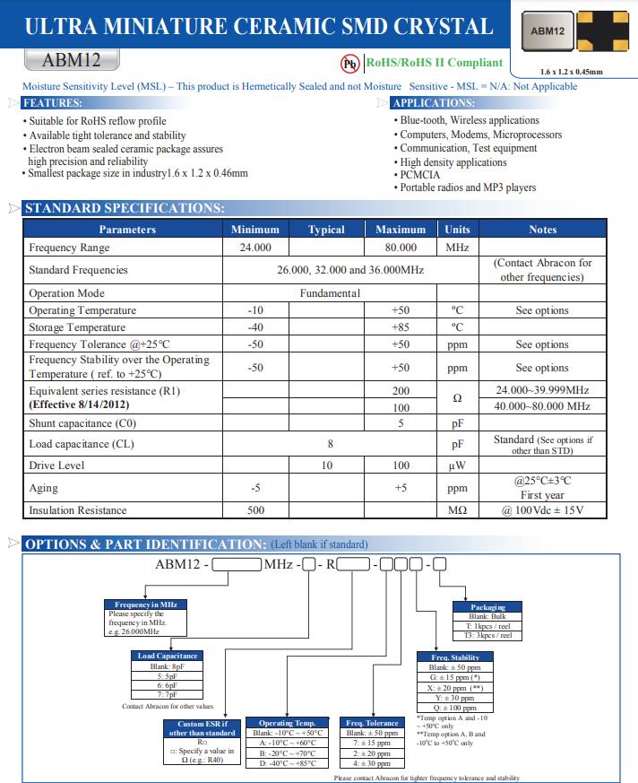 | ABM12-48.000MHZ-B2X-T3 | Abracon晶振 | ABM12 | 48 MHz | ±20ppm | 8pF |