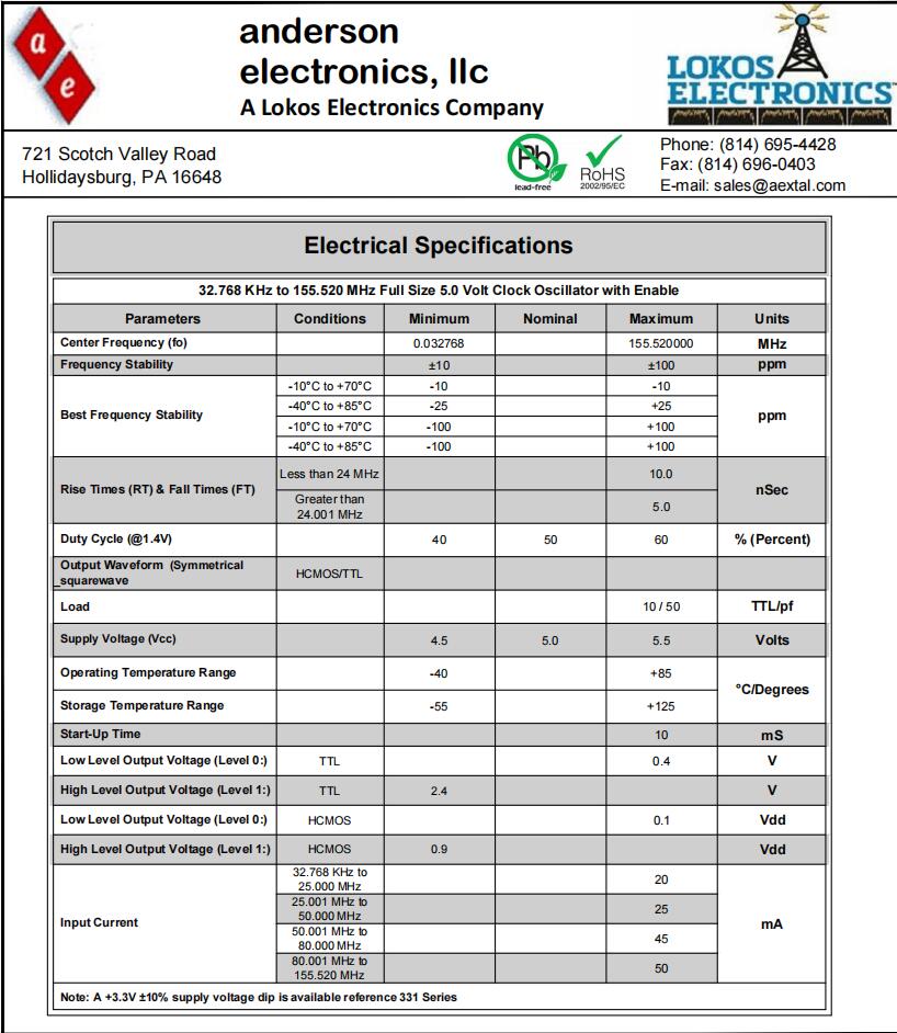Anderson進口晶振|AE431長方形鐘振|16.384MHz規格表