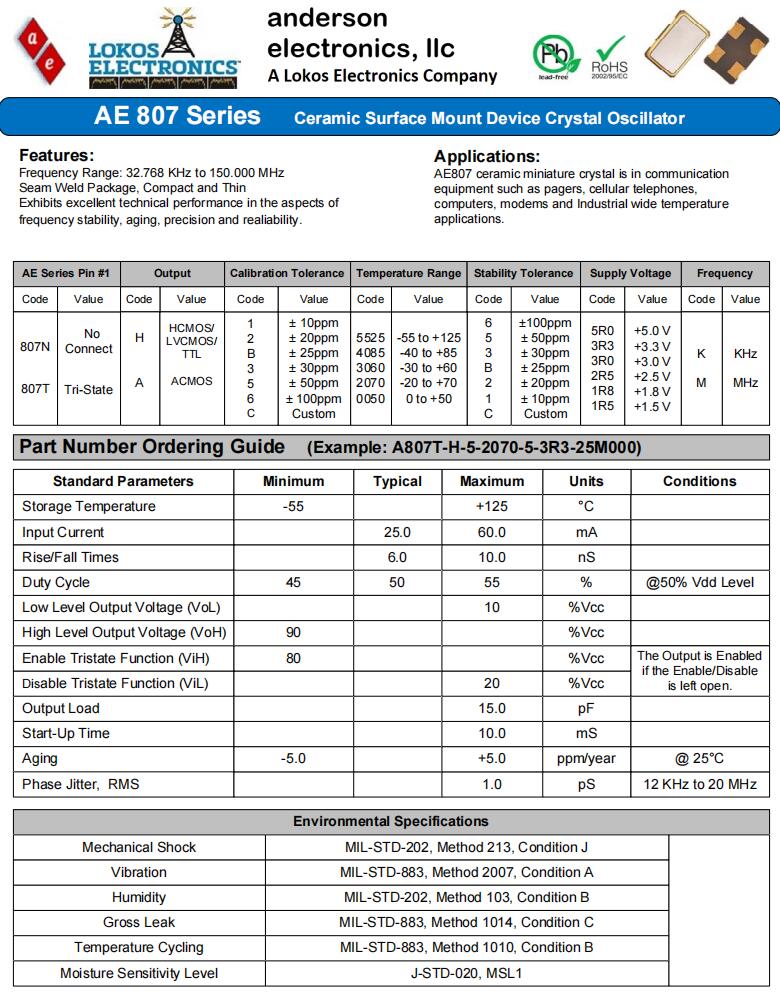 Anderson晶振|AE807T-H-2-4085-3-3R3-25M000|5032mm晶振,Anderson晶振,AE807進口晶振,有源晶振,AE807T-H-2-4085-3-3R3-25M000晶振,石英晶體振蕩器,5032mm晶振,四腳貼片晶振,SMD晶振,頻率25MHz,電壓3.3V,工作溫度-40~85°C,頻率容差20pm,緊湊薄晶振,低老化晶振,高可靠性晶振,蜂窩電話晶振,計算機應用晶振,調制解調器晶振,工業自動化晶振.