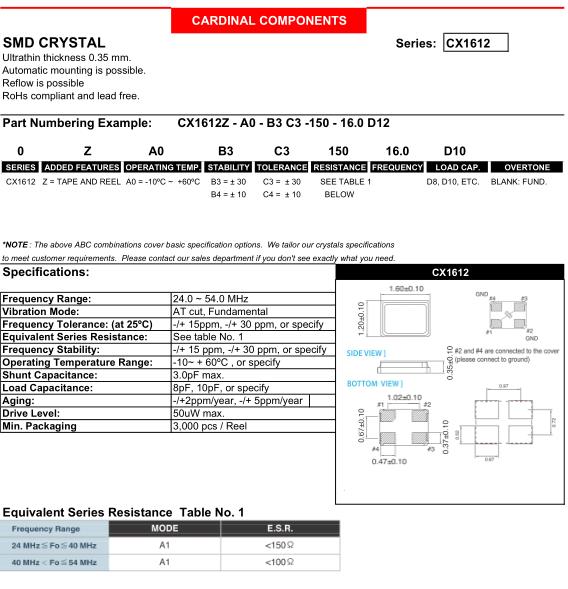 美國Cardinal貼片晶振,CX1612小體積晶振,CX1612Z-A0B4C4-150-16.0D12晶振