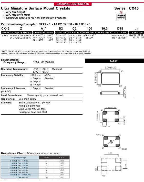 美國Cardinal晶振,CX45四腳晶振,CX45Z-A1B3C3100-12.0D18-3晶振