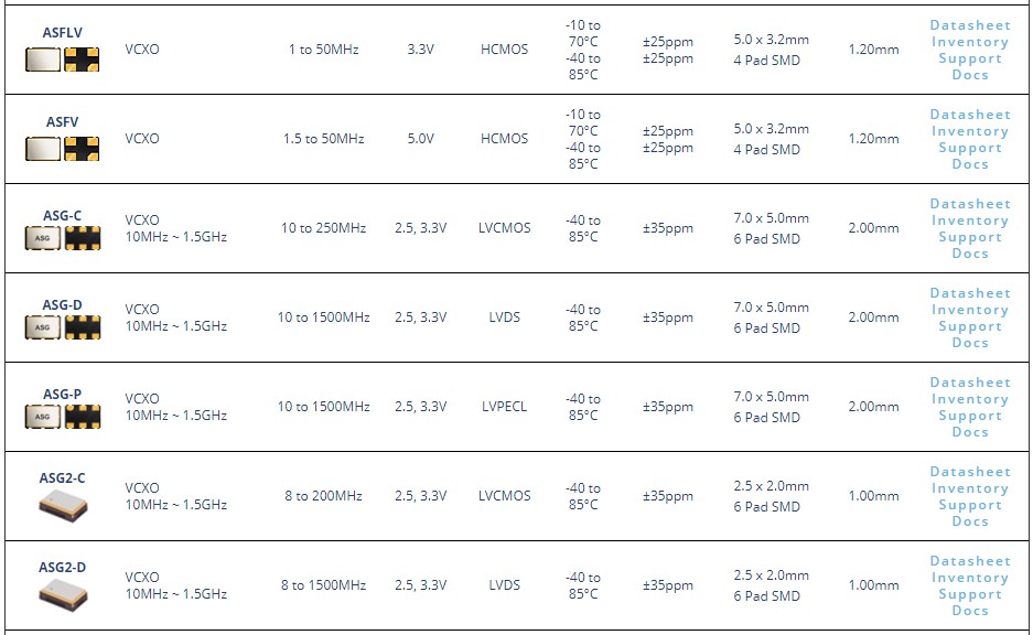 艾博康壓控晶振具有超低相位噪聲特點,具有低相位噪聲的VCXO晶振對于精確和高數據速率的RF應用是必需的.Abracon艾博康晶振,壓控晶振的超低相位噪聲ABLNO解決方案在100MHz偏移頻率和100MHz載波下實現-120dBc/Hz,為業界作出貢獻.以下為ASG-C-V-A-25.000MHZ壓控晶振參數,以及相關型號,晶振代碼等資料參考.