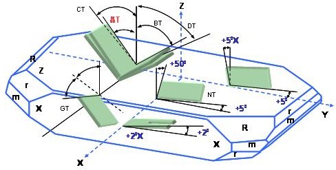 根據不同的應用領域以及不同環境下產品的工作溫度要求,因此創造了多種多樣不同的石英晶振切割角度方式.比如AT-,BT-CT-DT-NT-GT-等多種不同的切割板片.不同的切割方向的板片具有不同的彈性常數張量,不用的壓電常數張量以及不同的介電常數張量.而這些張量在石英,石英元件的設計以及應用上展現了不同的振蕩以及溫度特性(如下圖所示),表現了在Z-plat石英結構上,幾種不同方向的石英板片切割方式. 石英晶振的振動模態