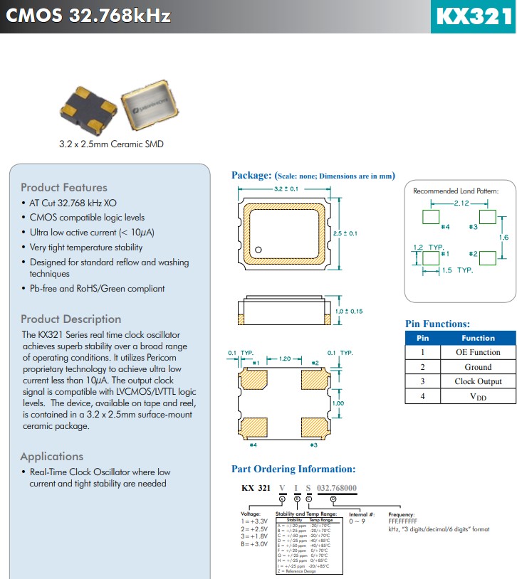 亞陶晶振KX321系列,編碼KX3211E0032.768000,實時時鐘振蕩器在廣泛的工作條件下實現了卓越的穩定性。電源電壓1.8V/2.5V/3.3V,頻率32.768kHz,CMOS晶體振蕩器,它利用Pericom專有技術實現小于10μA的超低電流。輸出時鐘信號與LVCMOS/LVTTL邏輯電平兼容。該器件采用卷帶包裝,小體積晶振尺寸采用3.2x2.5mm表面貼裝陶瓷封裝。