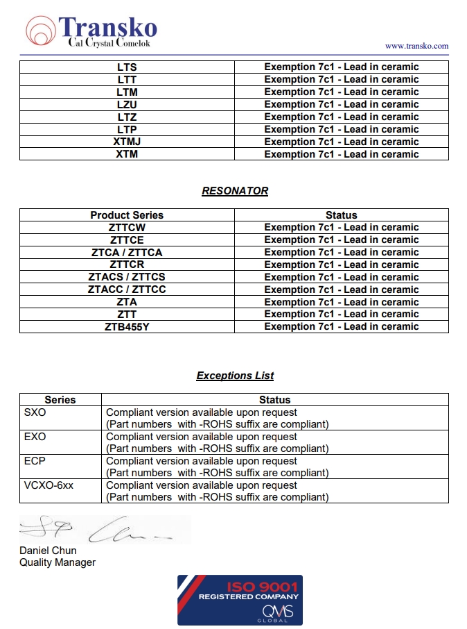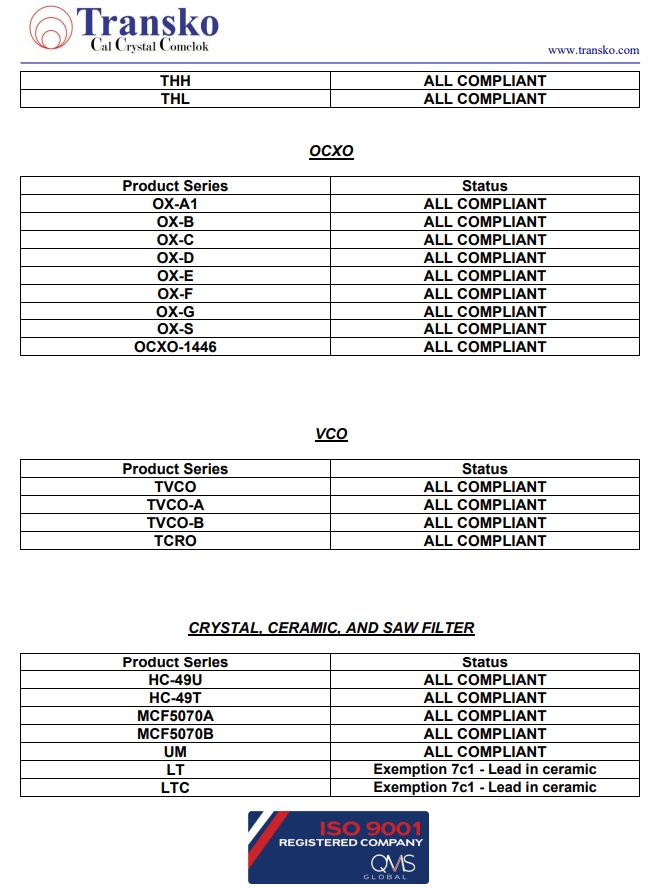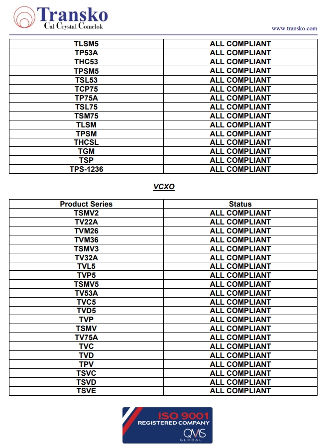 Transko Electronics, Inc.是一家領先的ISO 9001認證的電子行業頻率控制產品制造商,實施質量體系已滿足國家和國際質量體系的要求的需要。一直以來,Transko晶振的質量體系都持續符合ISO 9001的要求并不斷提高質量管理體系的有效性。提供優質的產品和服務是Transko Electronics, Inc.的既定政策,始終如一地滿足客戶的需求,實現了領先同行的高質量環保生產標準。