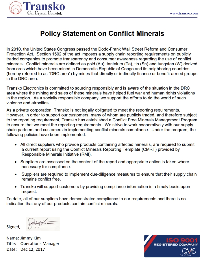 作為一家私營公司,Transko在法律上沒有義務滿足報告要求。 然而,為了支持我們的客戶,他們中的許多人是公開交易的,因此受到根據報告要求,Transko制定了無沖突礦產管理計劃來確保我們符合報告要求。我們努力與供應商合作實施沖突礦物法規的供應鏈合作伙伴和客戶。根據該計劃已經實施了以下政策: