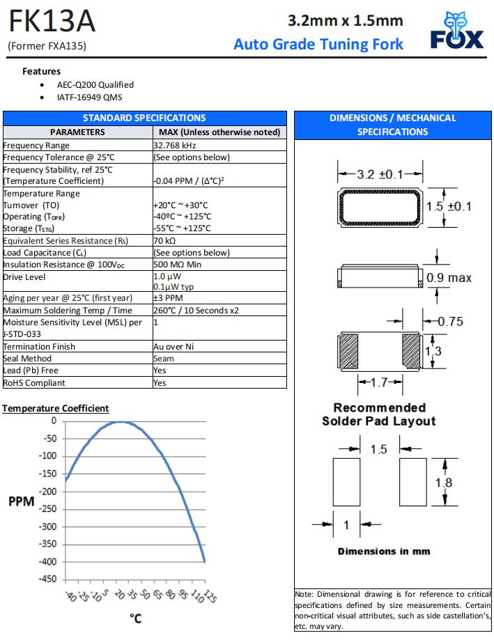 FK13AEIWI0.032768-T3,3215mm,FOX兩腳貼片晶振,鐘表電子晶振,規格表
