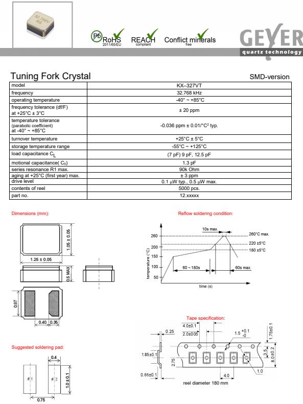 德國格耶晶振,KX-327VT無源晶體,超小型晶振,貼片表晶32.768K系列具有超小型,薄型,質地輕的表面貼片音叉型石英晶體振蕩器,晶振產品本身具備優良的耐熱性,耐環境特性,在辦公自動化,家電領域,移動通信領域可發揮優良的電氣特性,符合無鉛標準,滿足無鉛焊接的回流溫度曲線要求,金屬外殼的石英晶振使得產品在封裝時能發揮比陶瓷晶振外殼更好的耐沖擊性能.