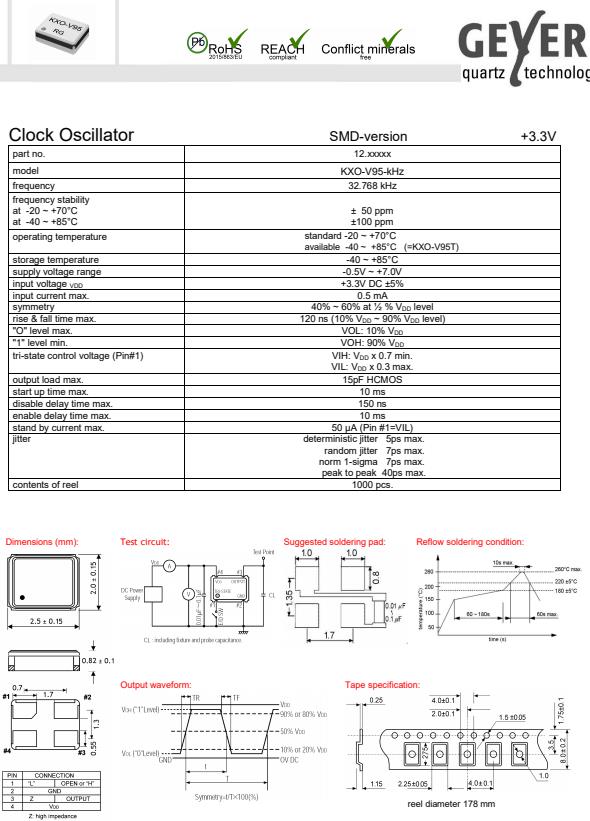 GEYER格耶晶振,KXO-V95-kHz時鐘晶振,高性能振蕩器, 有源晶振,是指晶體本身起振需要外部電壓供應,起振后可直接驅動CMOS集成電路,產品本身已實現與薄型IC(TSSOP封裝,TVSOP封裝)同樣的1mm厚度,斷開時的消費電流是15µA以下,編帶包裝方式可對應自動搭載及IR回流焊接(無鉛對應)產品有幾種電壓供選1.8V,2.5V,3V3.3V,5V,以應對不同IC產品需要.