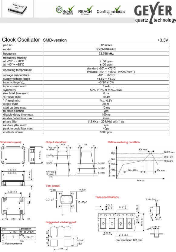 過高的靜電可能會損壞石英晶體諧振器,請注意抗靜電條件.請為容器和封裝材料選擇導電材料.在處理的時候,請使用電焊槍和無高電壓泄漏的測量電路,并進行接地操作.格耶德國晶振,KXO-V97-kHz石英振蕩器,32.768KHZ有源晶振.